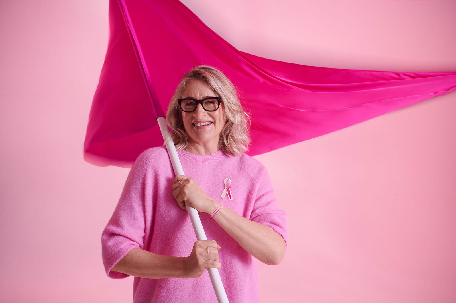 “Välillä elämä on tommosta ja välillä tämmöstä. On turha pelätä, koska aina eteen tulee jotain odottamatonta. Jokaiselle meistä. Siksi kannattaa mennä rohkeasti eteenpäin lippu liehuen. Roosa nauha ja ranneke voivat olla jollekin se ratkaiseva läpimurto, jolloin lippu nousee puolitangon ohi korkeuksiin. Kun kannat Roosa nauhaa rinnassasi, kaikki menee päin elämää.”