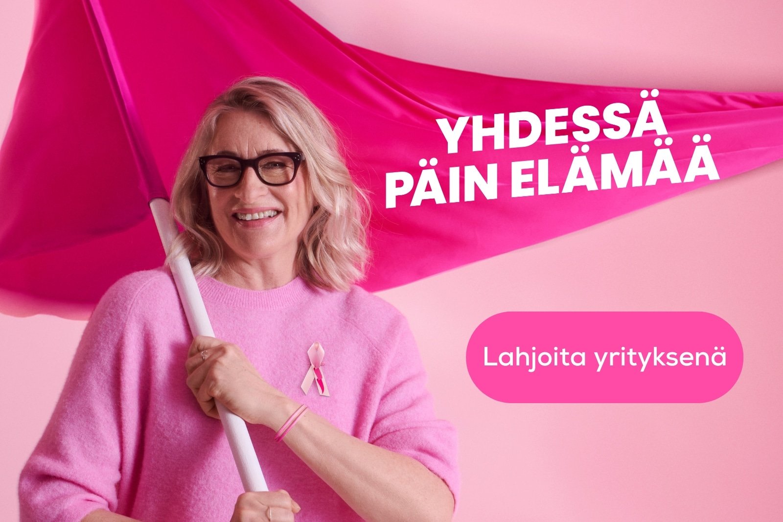 Mennään yhdessä päin elämää. Yrityslahjoittajille tarjoamme kiitoksena Roosa nauhan materiaalipaketin.