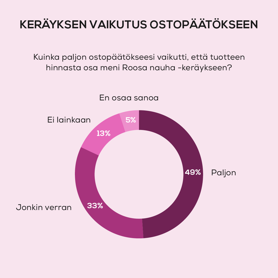 Tutkimuksen* mukaan yhteistyö Roosa nauha -kampanjan kanssa vaikuttaa merkittävästi yrityksen tuotemyyntiin. 82 % tuotteen ostaneista kansalaisista kertoi, että tuotteen Roosa nauha -kumppanuudella oli positiivista vaikutusta heidän ostopäätökseensä.